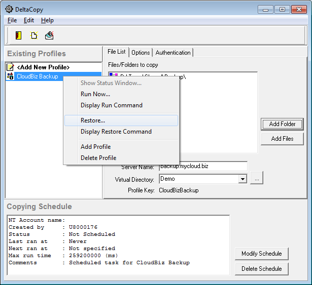15. หากผู้ใช้ต้องการเรียกคืนไฟล์จาก server สามารถคลิ้กขวาที่ Profile จากนั้นเลือก Restore